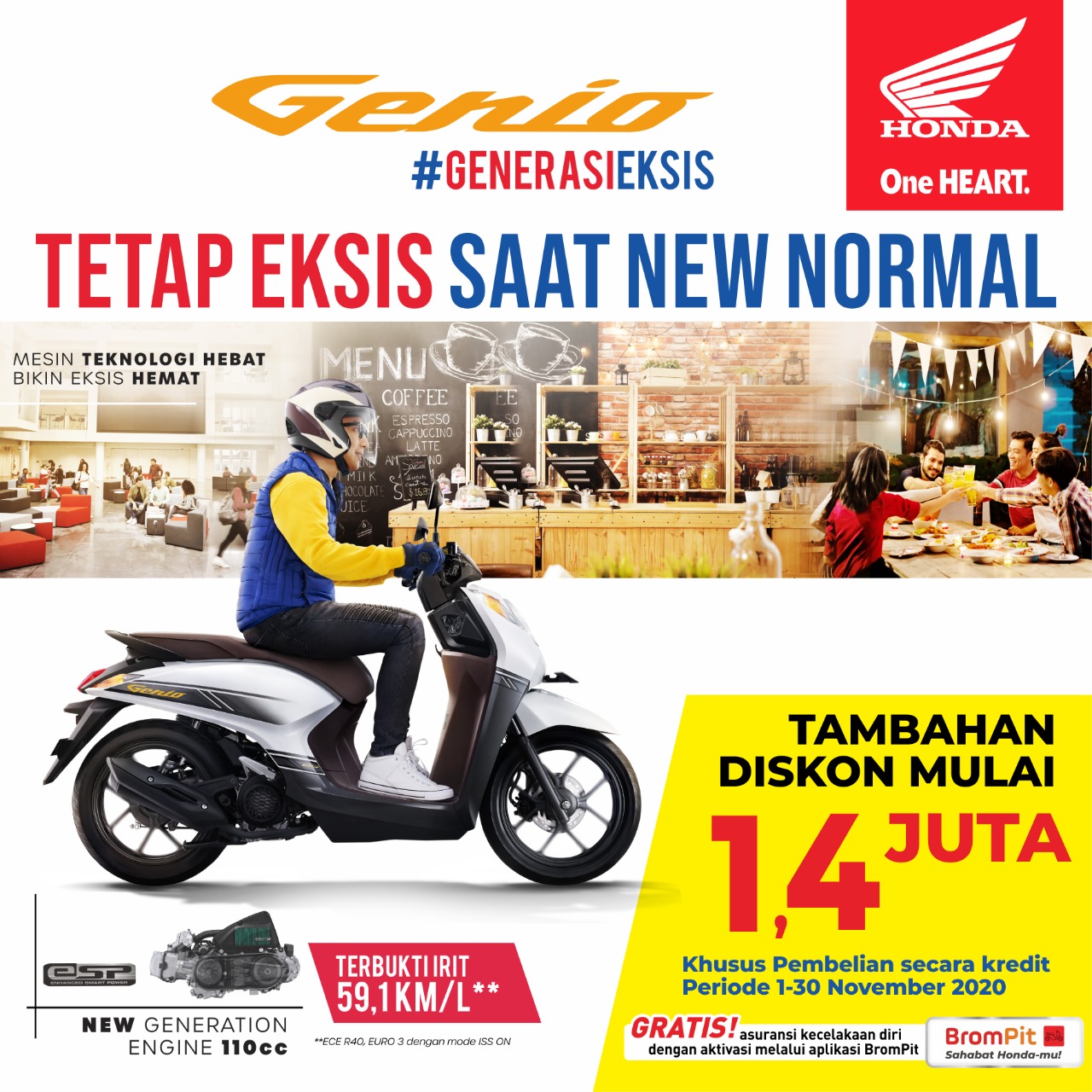 Konsumen yang ingin tetap eksis dengan motor teknologi hebat Honda Genio akan mendapatkan diskon sebesar 1.400.000 untuk pembelian secara kredit. Juga cashback mulai 1.100.000 untuk pembelian Honda BeAT ditambah 2 jaket ekslusive.