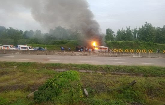KLIKJATIM.Com I Ngawi - Mobil Elf bernopol DK 8725 GV terlibat kecelakaan dengan truk bermuatan spons D 8389 TM di tol Ngawi arah Surabaya KM 631.400, Kamis (3/12/2020) pagi. Mobil terbakar dan tiga orang dinyatakan tewas.