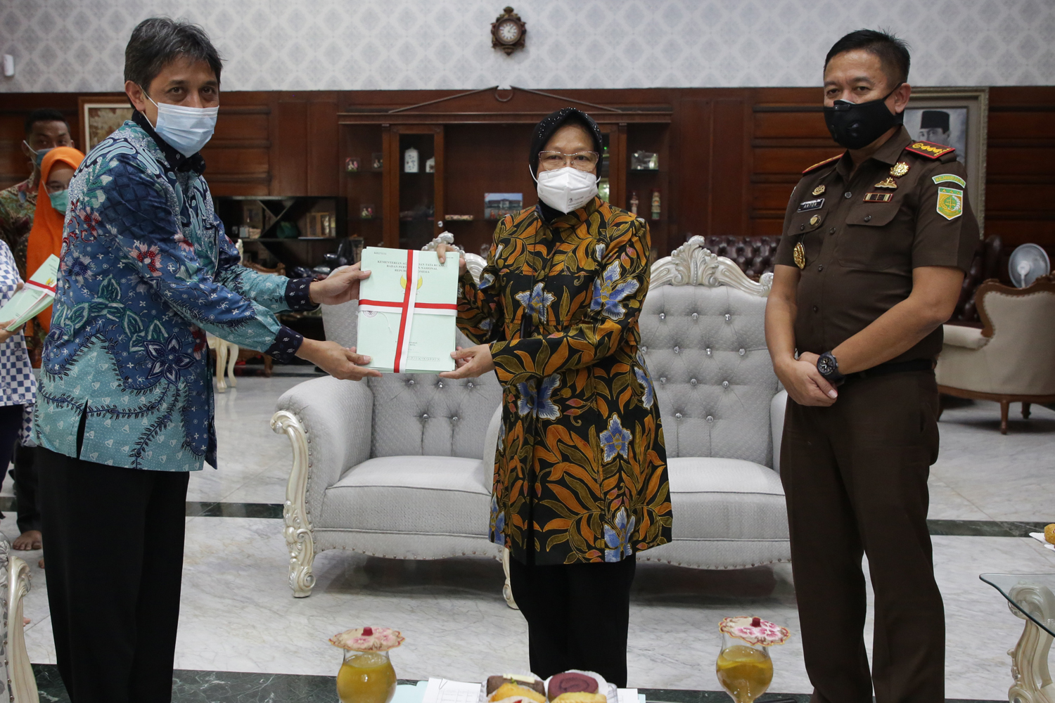 KLIKJATIM.com | Surabaya - Wali Kota Surabaya Tri Rismaharini dan jajaran Pemerintah Kota (Pemkot) Surabaya terus berupaya menyelamatkan aset pemkot. Disaksikan Kepala Kejaksaan Negeri (Kejari) Surabaya Anton Delianto, Wali Kota Risma menerima 29 sertifikat aset pemkot dari Badan Pertanahan Nasional (BPN) 1 Surabaya di rumah dinas Wali Kota Surabaya, Jalan Sedap Malam, Surabaya, Kamis (3/12/2020).