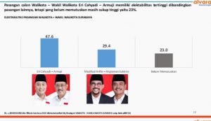 Untuk Surabaya,Alvara mencatat ada aspek elektabilitas (keterpilihan) jika Pilkada dilakukan hari ini. Pasangan Eri Cahyadi–Armuji memiliki tingkat elektabilitas 47,6%, jauh mengungguli pasangan Machfud Arifin–Mujiaman Sukirno yang hanya mendapatkan elektabilitas 29,4%. Sementara yang belum memutuskan sebanyak 23%.