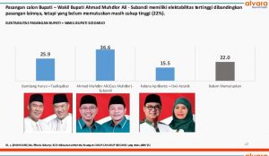 Sedangkan Pilbup Sidoarjo agaknya cukup ketat persaingannya. Meski elektabilitasnya tertinggi, namun pasangan Ahmad Mudhlor Ali dan Subandi hanya terpaut lumayan dengan dua pasangan lainnya.