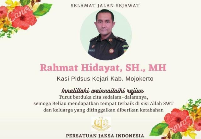 KLIKJATIM.Com| Mojokerto - Pasien meninggal dunia akibat Covid masih terus berjatuhan. Kali ini Kepala Seksi Pidana Khusus (Pidsus) Kejaksaan Negeri (Kajari) Kabupaten Mojokerto, Rahmat Hidayat (41) meninggal dunia karena terpapar virus covid-19. Rahmat terpapar covid-19 disertai penyakit komorbid atau penyerta yakni asma.