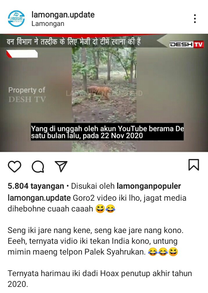Dalam video yang diunggah akun tersebut, terlihat kanal bernama DESH TV berisi video harimau dan lingkungan hutan yang sama dengan video yang sebelumnya beredar, hanya saja bercaption bahasa india dan telah diposting sebulan lalu.