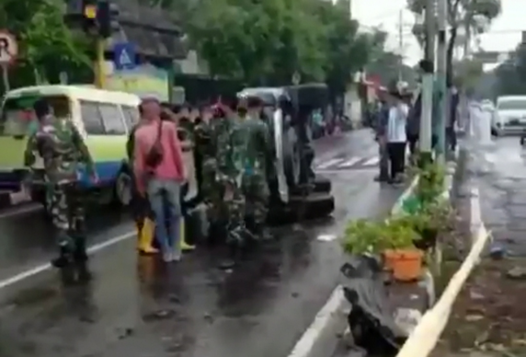 KLIKJATIM.Com | Gresik — Mobil Mitsubihi Pajero terbalik saat mengalami insiden kecelakan tunggal di Jalan Raya RA. Kartini Kecamatan Gresik dekat Kodim Gresik. Satu penumpang alami luka-luka.