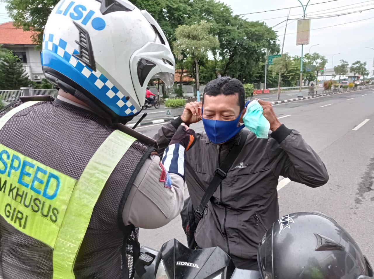 Namun dalam kegiatan kali ini mereka tidak melakukan penindakan. Hanya pembagian masker sambil sosialisi terkait keselamatan berlalu lintas kepada pengguna jalan di sejumlah titik seperti di Perbatasan Gresik-Surabaya, Senin (25/1/2021).