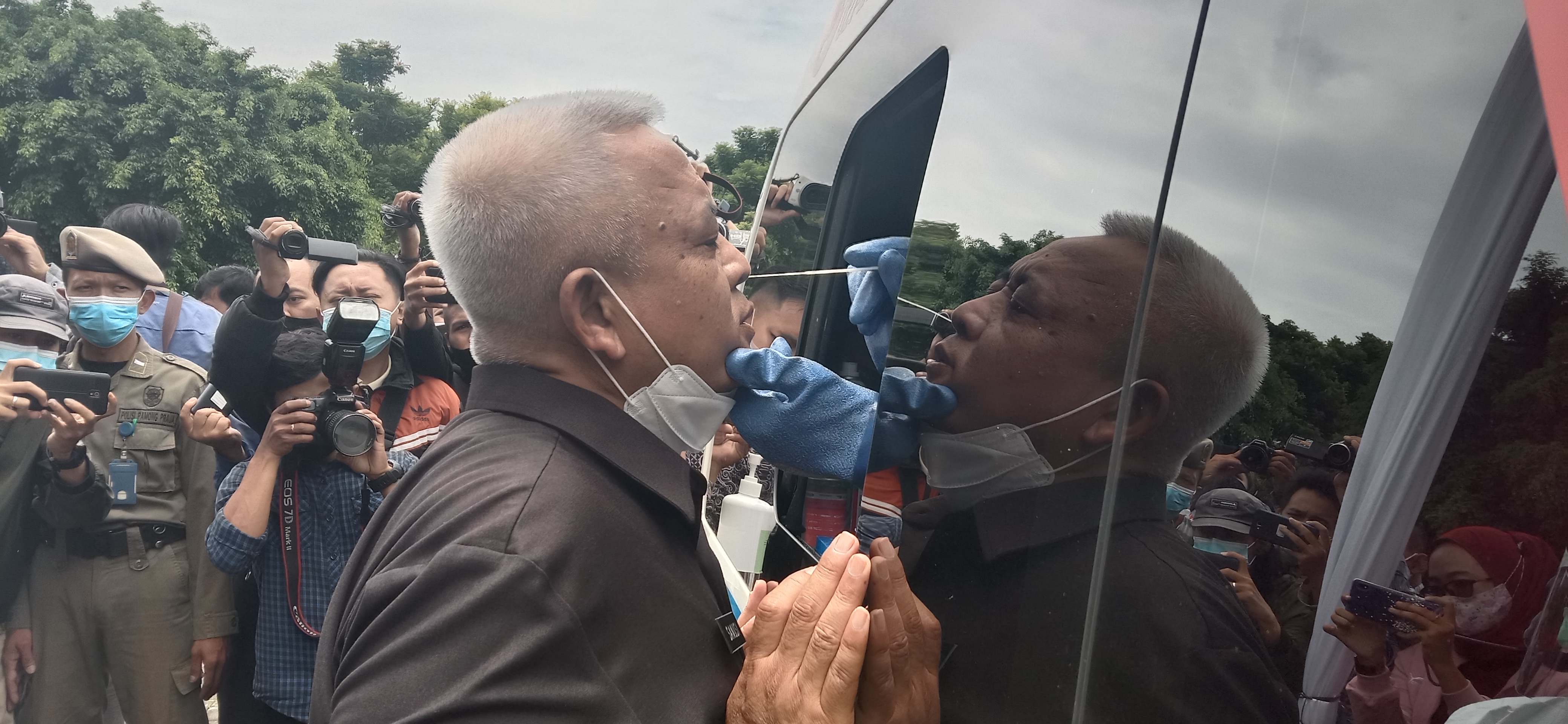 Di sela pencanangan vaksinasi covid-19 Kabupaten Malang, Bupati Sanusi terlihat ikut ambil bagian dalam tes swab bersama Kapolres Malang, AKBP Hendri Umar, serta Damdim Kabupaten Malang-Kota Batu, Letkol (Inf) Yusub Dody Sandra. (Asral/mkr)