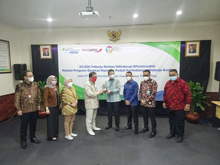 KLIKJATIM.Com | Surabaya - Untuk memberikan jaminan perlindungan sosial bagi pekerja rentan di Jawa Timur, Bank Jatim memberikan CSR melalui program Gerakan Nasional Perlindungan Pekerja Rentan (GN Lingkaran) BPJS Ketenagakerjaan. Perlindungan jaminan sosial itu diberikan pada 35.000 tenaga kerja informal atau bukan penerima upah (BPU) selama 3 bulan itu dilakukan di Kantor Wilayah BPJS Ketenagakerjaan Jatim, Selasa (9/2/2021).