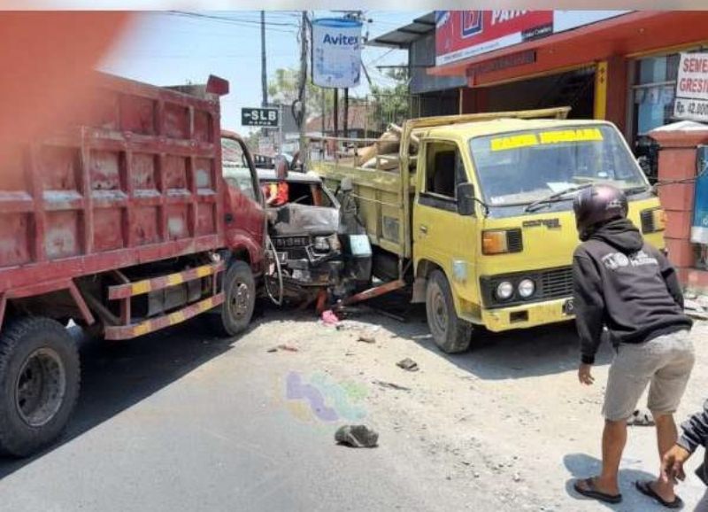 KLIKJATIM.Com | Bojonegoro - Tabrakan mengenaskan terjadi di Proliman Kapas, Kecamatan Kapas, Kabupaten Bojonegoro, Jumat (18/10/2019). Sebuah pickap L 300 bernopol S 8633 A dijepit truk pengangkut bahan bangunan dan dump truk.