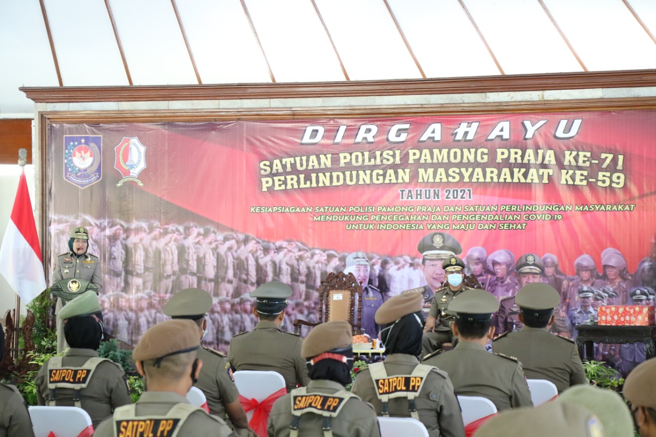 KLIKJATIM.Com | Bojonegoro—HUT Satuan Polisi Pamong Praja (Satpol PP) ke- 71 serta Perlindungan Masyarakat (Linmas) ke- 59 tahun 2021 di gelar di Pendopo Malowopati Kabupaten Bojonegoro. Peringatan ini dilakukan dengan tasyakuran bersama.