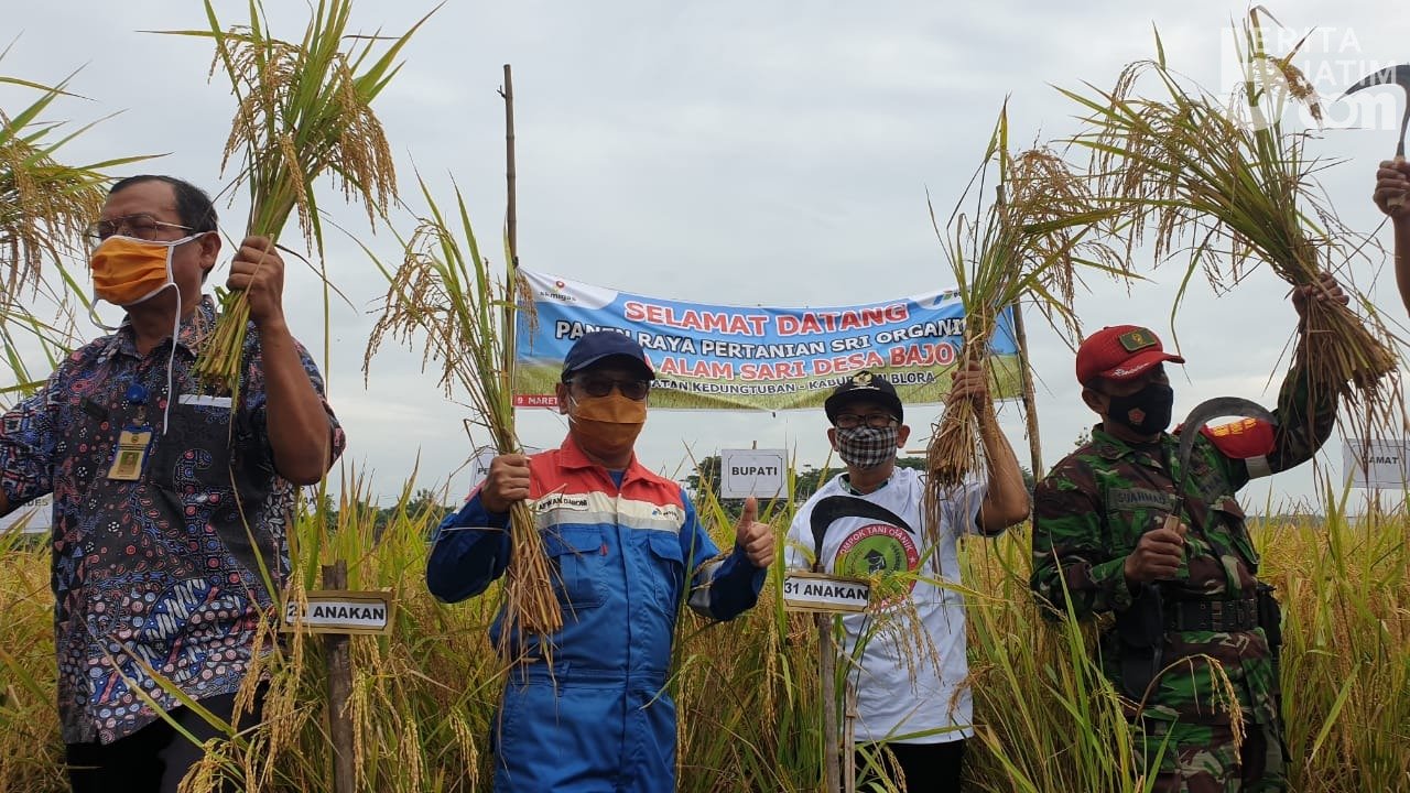 KLIKJATIM.Com | Blora - Kelompok Bina Alam Sri di Desa Bajo dan Ngraho Kecamatan Kedungtuban, Kabupaten Blora, menggelar panen raya bersama Pertamina EP dan perwakilan pemerintah daerah Kabupaten Blora, Selasa (9/3/2021). Panen kali ini menghasilkan 9,3 ton per hektar dari total luasan 13,6 hektar lahan para anggota kelompok.