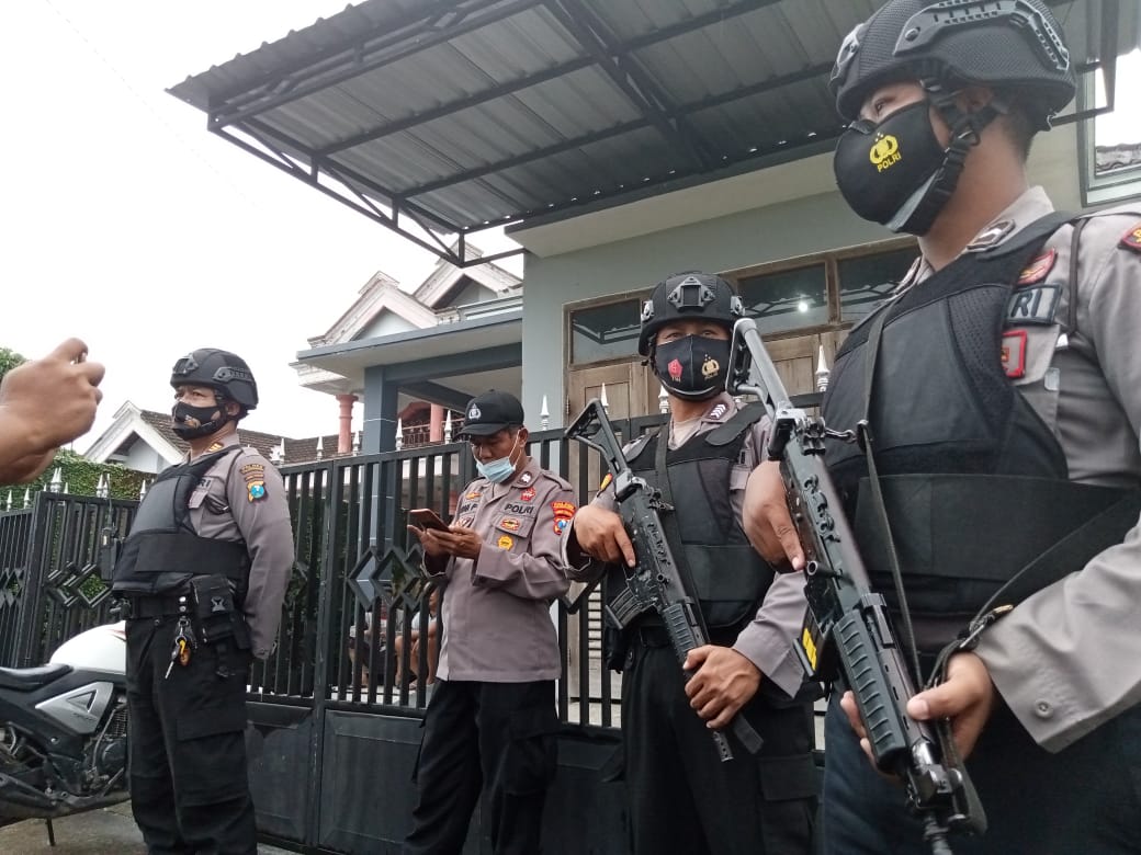 [irp]Polisi bersenjata lengkap ini mengamankan proses penggeledahan di rumah mertua N (44), terduga teroris yang ditangkap Densus 88 pada Selasa ini.
