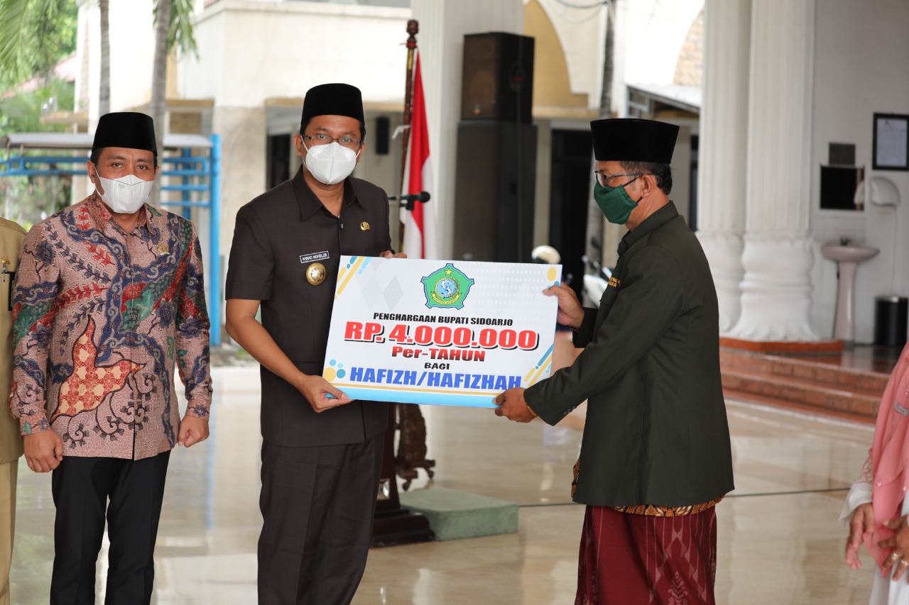 KLIKJATIM.Com | Sidoarjo—Ratusan penghafal Al Qur'an atau hafidz dan hafidzoh mendapat penghargaan dari Bupati Sidoarjo Ahmad Muhdlor (Gus Muhdlor). Penghargaan berupa uang sebesar 4 juta rupiah tersebut diserahkan Bupati Gus Muhdlor di Pendopo Delta Wibawa, Senin(12/4/2021).