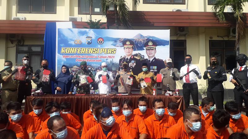 KLIKJATIM.Com | Pasuruan - Sedikitnya 25 orang tersangka yang terlibat peredaran narkotika dan obat-obatan terlarang diamankan Satuan Narkoba Polres Pasuruan. Mereka diamankan dalam kegiatan Operasi Pekat Semeru 2021 yang digelar selama 12 hari mulai 22 Maret hingga 2 April 2021.