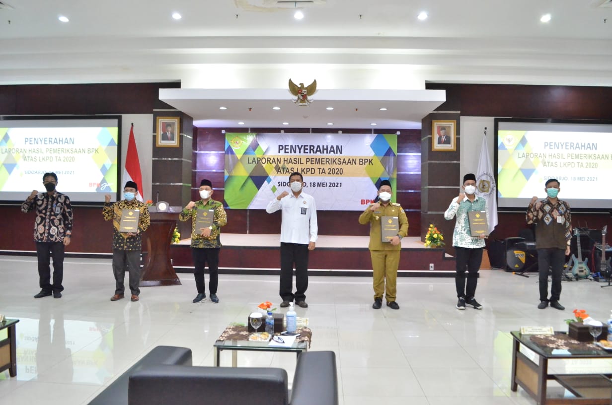 Bupati Gresik Fandi Akhmad Yani atau yang akrab disapa Gus Yani menerima Buku laporan tersebut dari Kepala BPK Perwakilan Jawa Timur Joko Agus Setyono di Kantor BPK Perwakilan Jawa Timur di Sidoarjo, Selasa (18/5/2021).