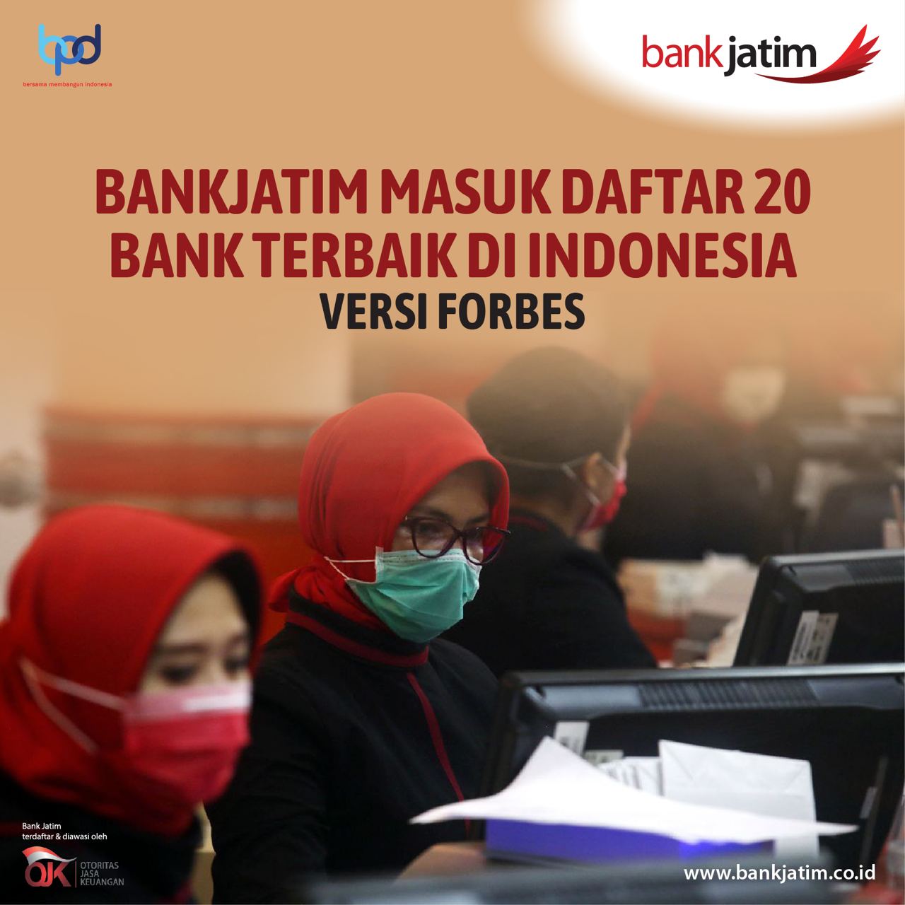 KLIKJATIM.Com | Surabaya - PT Bank Pembangunan Daerah Jawa Timur Tbk. (bankjatim) masuk dalam daftar 20 bank terbaik The World's Best Banks 2021 versi Majalah Forbes untuk region Indonesia. Pencapaian ini menjadikan bankjatim menjadi satu-satunya Bank Pembangunan Daerah (BPD) di Tanah Air yang masuk dalam daftar bergengsi tersebut.
