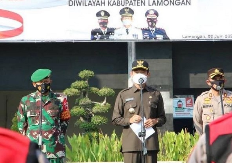 KLIKJATIM.Com | Lamongan—Bupati Lamongan Yuhronur Efendi (YES), Dandim 0812 Lamongan Letkol Inf. Sidik Wiyono, dan Kapolres Lamongan AKBP Miko Indrayana melakukan Apel Gelar Pasukan di Halaman Pemkab Lamongan, Selasa (8/6/2021). Apel guna mengukur kesiapan Pemberlakuan Pembatasan Kegiatan Masyarakat (PPKM) berskala mikro di wilayah Kabupaten Lamongan.