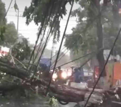 KLIKJATIM.Com | Madiun - Hujan deras disertai angin kencang terjadi di Kota Madiun pada Jumat (13/12/2019) sore. Meski hanya berlangsung sekitar satu jam, amukan angin kencang menyebabkan sejumlah pohon tumbang dan merusak sejumlah bangunan. Saluran kabel listrik di sejumlah titik putus dan mengganggu pasokan listrik ke sejumlah wilayah.