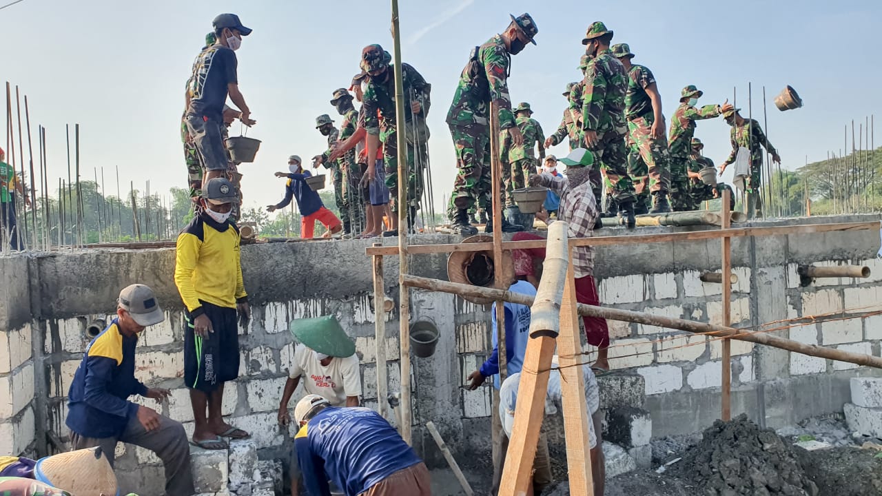 KLIKJATIM.Com | Bojonegoro—Puluhan anggota TNI dari Koramil jajaran Kodim 0813 Bojonegoro, bergotong-royong bersama elemen masyarakat melakukan karya bakti pengecoran pembangunan Masjid Roudhotul Jannah di Dusun Kupas, Desa Sumberoto, Kecamatan Kepohbaru.