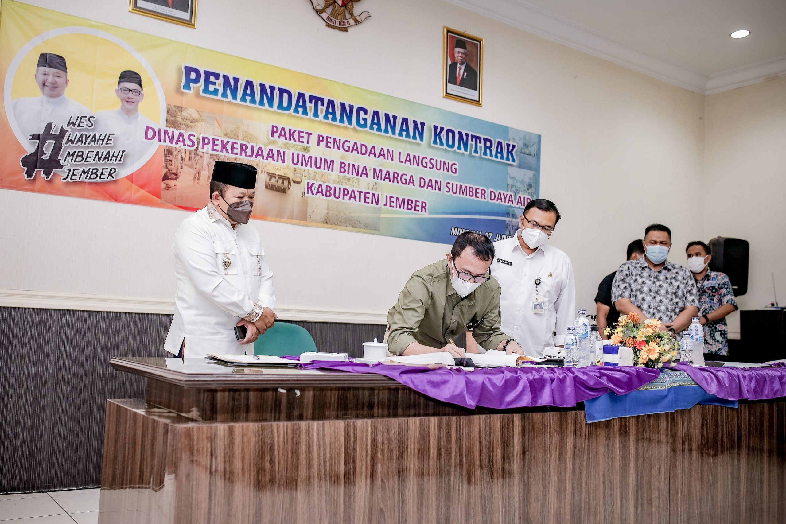 KLIKJATIM.Com I Jember – Bupati Jember, Ir. H. Hendy Siswanto melakukan penandatanganan kesepakatan kontrak paket pengadaan langsung dari Dinas PU Bina Marga dan Sumber Daya Air Kabupaten Jember, Minggu (27/06/2021).