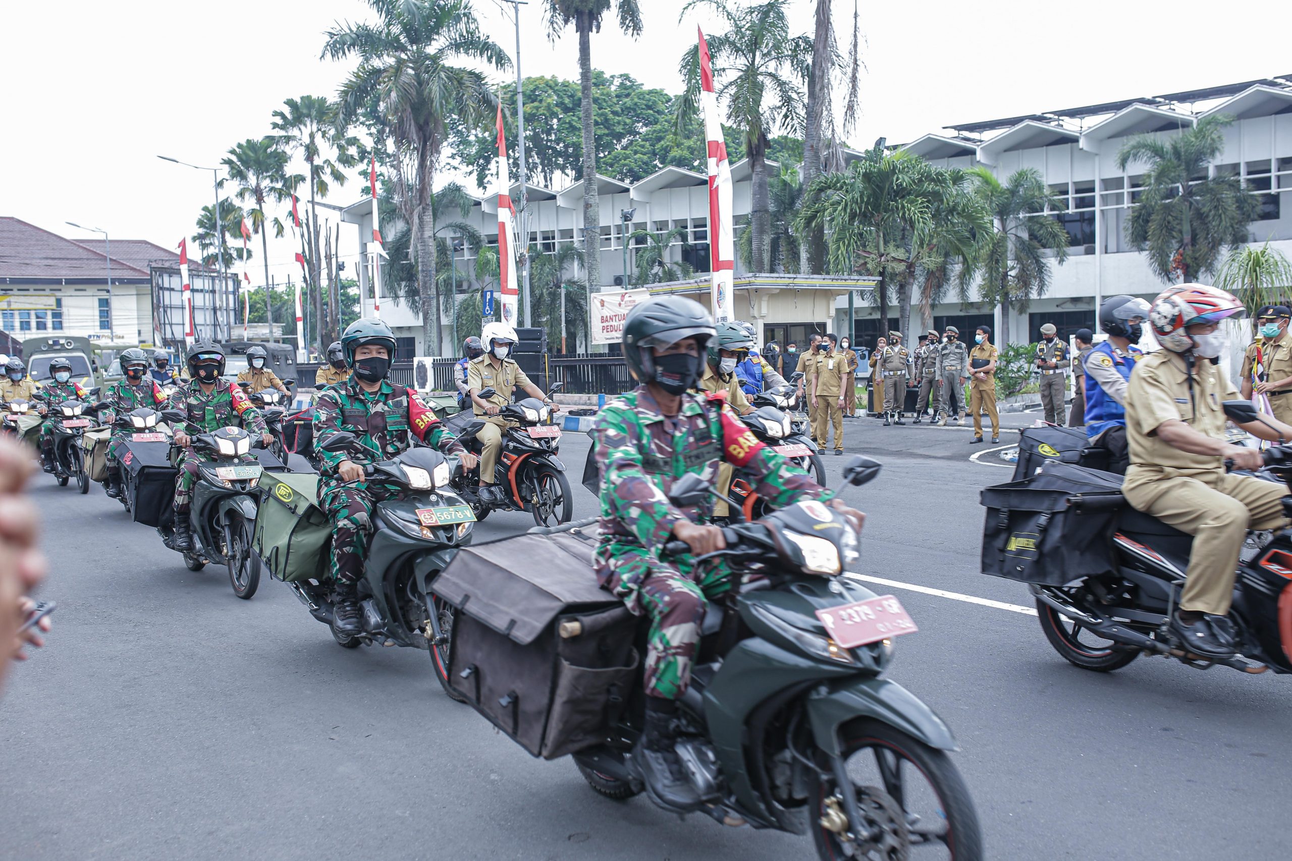 Usai apel, Bupati Hendy melepas pasukan tersebut untuk mendistribusikan bantuan sosial berupa beras kepada warga Kabupaten Jember yang tidak mampu.