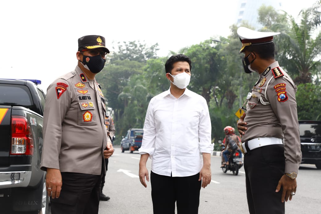 KLIKJATIM.Com | Surabaya - Wakil Gubernur Jawa Timur Emil Elestianto Dardak mengikuti peninjauan bersama Wakapolda Jatim ke penyekatan kendaraan yang hendak masuk Kota Surabaya melalui Bundaran Waru didepan Mall Cito pada hari pertama Pemberlakuan Pembatasan Kegiatan Masyarakat (PPKM) Darurat, Sabtu (03/07/2021).