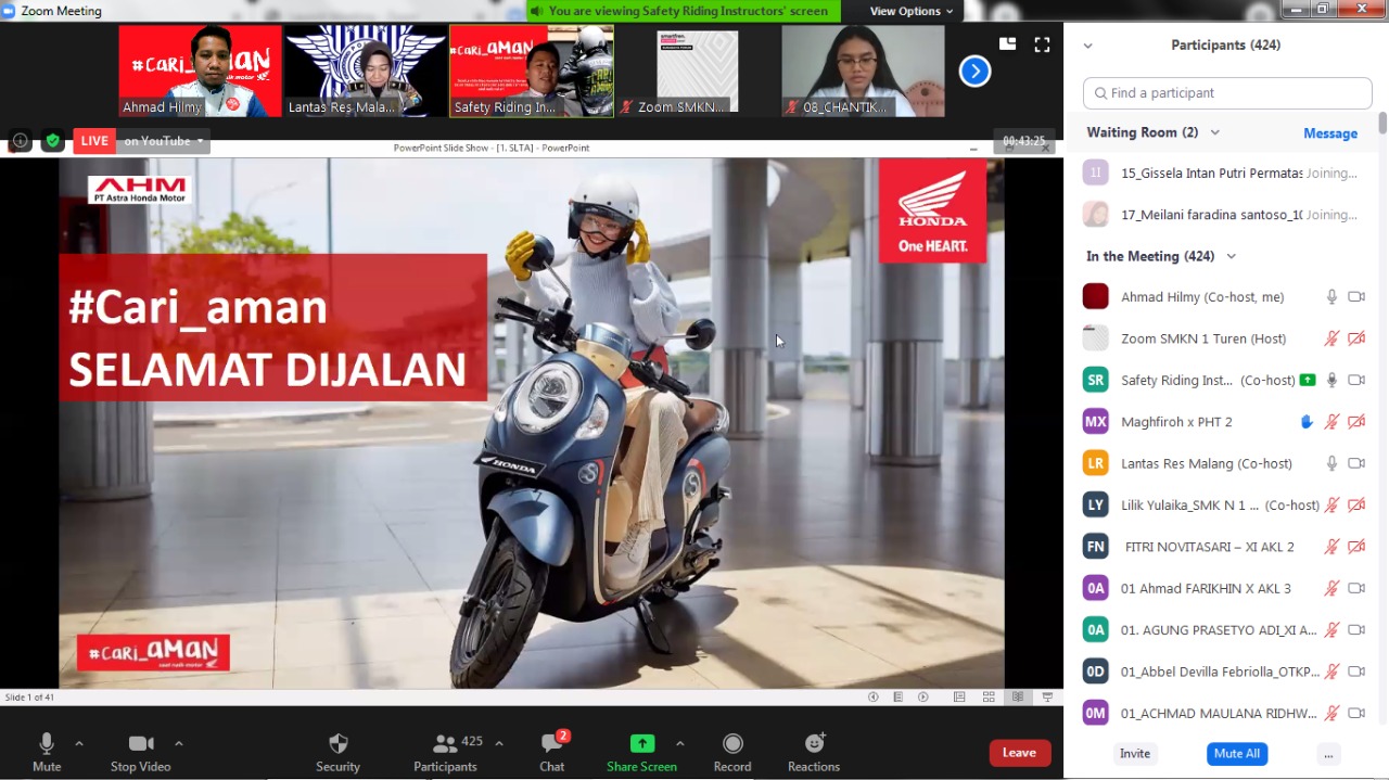 Kegiatan webinar ini diikuti oleh lebih dari 500 siswa baru dari berbagai jurusan. Pada edukasi kali ini disampaikan pentingnya kenyamanan berkendaraan di jalan raya dan sebelum mengendarai motor diharuskan memeriksa kendaraan. Mulai dari perlengkapan berkendara, sampai dengan kondisi motornya seperti pengecekan tekanan ban, lampu yang disampaikan oleh Instriuktur Safety Riding MPM Honda Jatim.