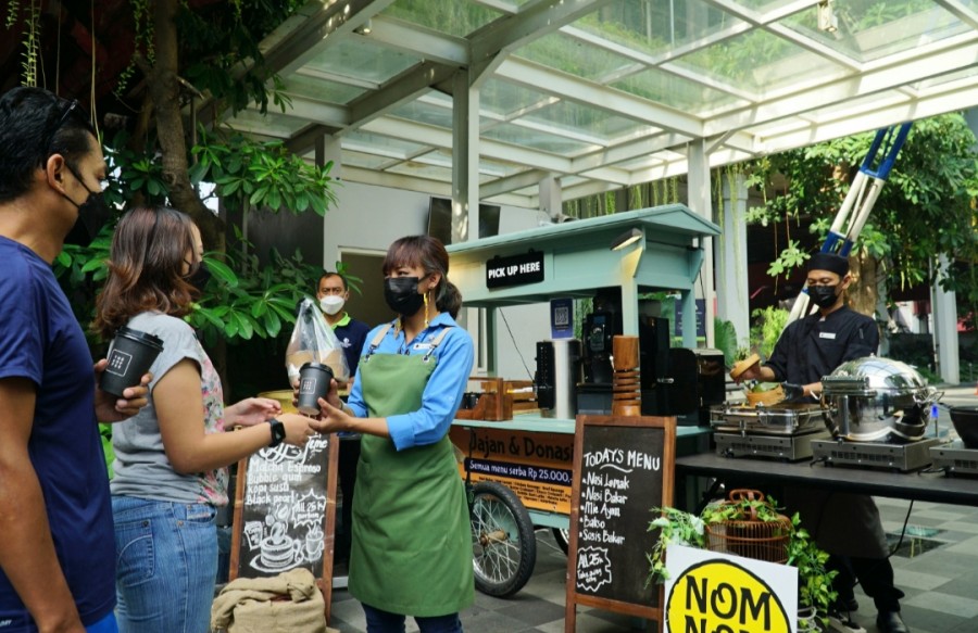 Setiap hari mulai dari pukul 06:00 hingga 12:00, area depan hotel disulap menjadi gerai makanan dan minuman takeaway dengan nama Nom Nom. Menyediakan banyak pilihan menu lezat seperti nasi lemak, nasi bakar, sosis, pilihan roti, donat, kopi, dan minuman lainnya dengan harga serba Rp 25.000.