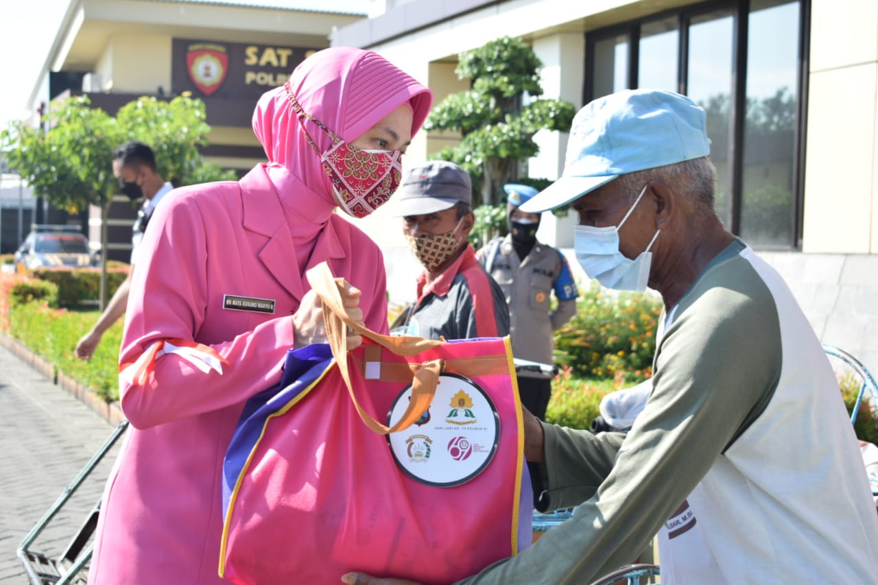 KLIKJATIM.Com I Sidoarjo - Dalam rangka peringatan Hari Kesatuan Gerak Bhayangkari (HKGB) ke-69 dan Hari Jadi Polwan ke-73 tahun 2021, polisi Wanita (Polwan) Polresta Sidoarjo salurkan 600 paket sembako kepada warga Kota Delta yang terdampak pandemi Covid-19.