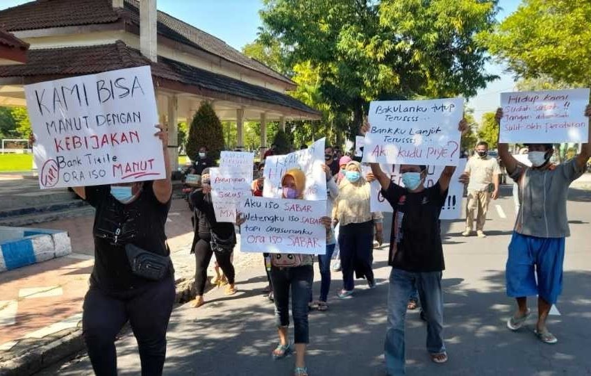 “Bakulan tutup terus, bank-ku lanjut terus,” tulis seorang PKL di poster yang dibawanya sambil berjalan.
