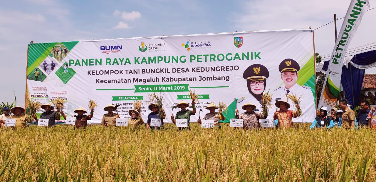 “Kampung Petroganik merupakan bentuk dukungan Petrokimia Gresik terhadap Program Peningkatan Produksi Pangan atau P4 milik pemerintah,” jelas Direktur Pemasaran PG, Meinu Sadariyo, saat mengikuti panen raya padi di Kampung Petroganik Desa Kedungrejo, Kecamatan Megaluh, Jombang, berama bersama mitra produksi pupuk organik Petroganik, distributor dan Pemkab Jombang, Senin (11/03/2019).