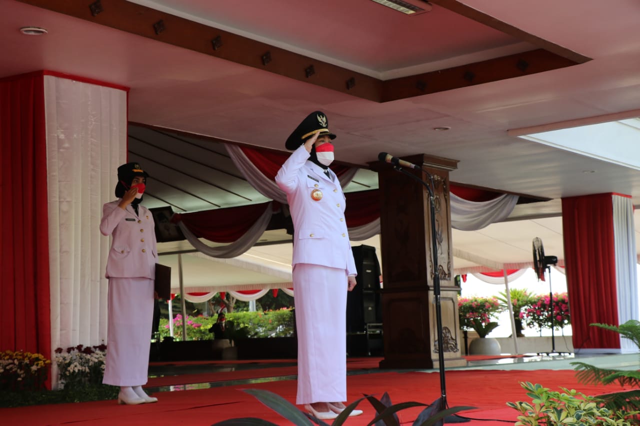 KLIKJATIM.Com | Bojonegoro—Bupati Bojonegoro Anna Mu'awanah memimpin upacara memperingati HUT Ke-76 Republik Indonesia di Pendopo Malowopati Pemkab Bojonegoro pada Selasa (17/8/2021). Dengan di ikuti peserta yang terbatas yaitu mulai dari perwakilan aparatur sipil negara di lingkup Pemkab Bojonegoro serta turut hadir Sekretaris Daerah dan sejumlah kepala OPD.