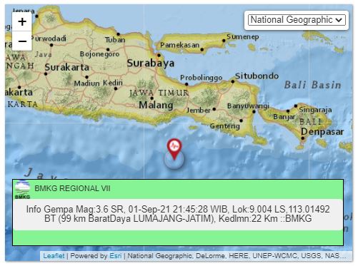 KLIKJATIM.Com | Surabaya - Gempa bumi tektonik Magnitudo 3,7 mengguncang wilayah selatan Pulau Jawa pada Rabu (1/9/2021) sekitar pukul 21.45 WIB.