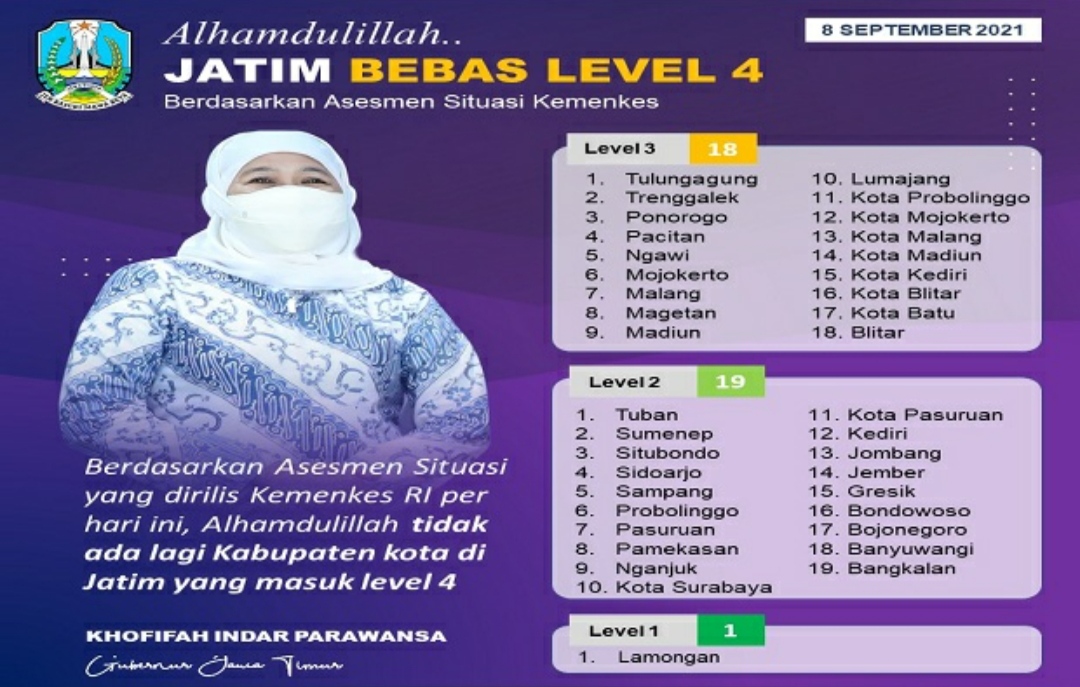 KLIKJATIM.Com | Surabaya--Di Provinsi Jatim saat ini tidak ada lagi daerah dengan status level 4. Seluruh Kabupaten/kota di Jatim kini menyandang status level 3 dan 2. Sementara Kabupaten Lamongan jadi satu-satunya daerah di Jawa dengan status level 1.