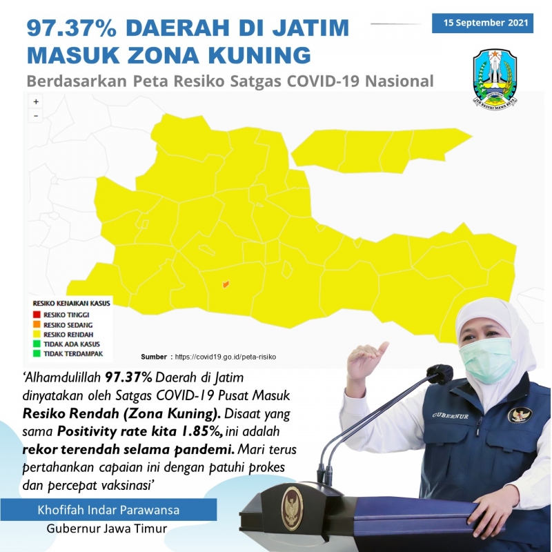 "Alhamdulillah, 97,37�erah di Jatim dinyatakan oleh Satgas Covid-19 Nasional masuk resiko rendah (zona kuning). Di saat yang sama, positivity rate kita mencapai 1,85%. Ini adalah rekor terendah selama pandemi bahkan jauh di bawah ketentuan yang diberlakukan WHO yaitu <5% Positivity Rate,” ujar Khofifah di Gedung Negara Grahadi, Surabaya, Kamis (16/9) pagi.