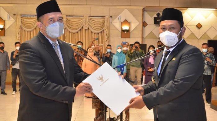 Bupati Fandi Akhmad Yani didampingi Wakil Bupati Aminatun Habibah, Dandim 0817 Gresik Letkol Inf Taufik Ismail, Kapolres Gresik AKBP Muchamad Nur Azis dan Sekda Gresik Washil. SK PENGANGKAT SEKDA: Bupati Gresik Fandi Akhmad menyerahkan SK Sekda Gresik kepada Achmad Washil Miftachul Rachman usai pelantikan di Ruang Mandala Bhakti Praja Kantor Bupati Gresik pada Kamis, (30/9/2021).
