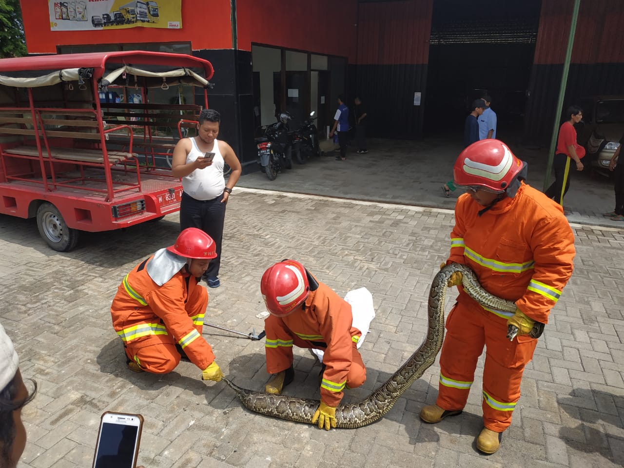 Pihak bengkel kemudian melaporkan keberadaan ular tersebut ke petugas Pemadam Kebakan (PMK) Gresik.