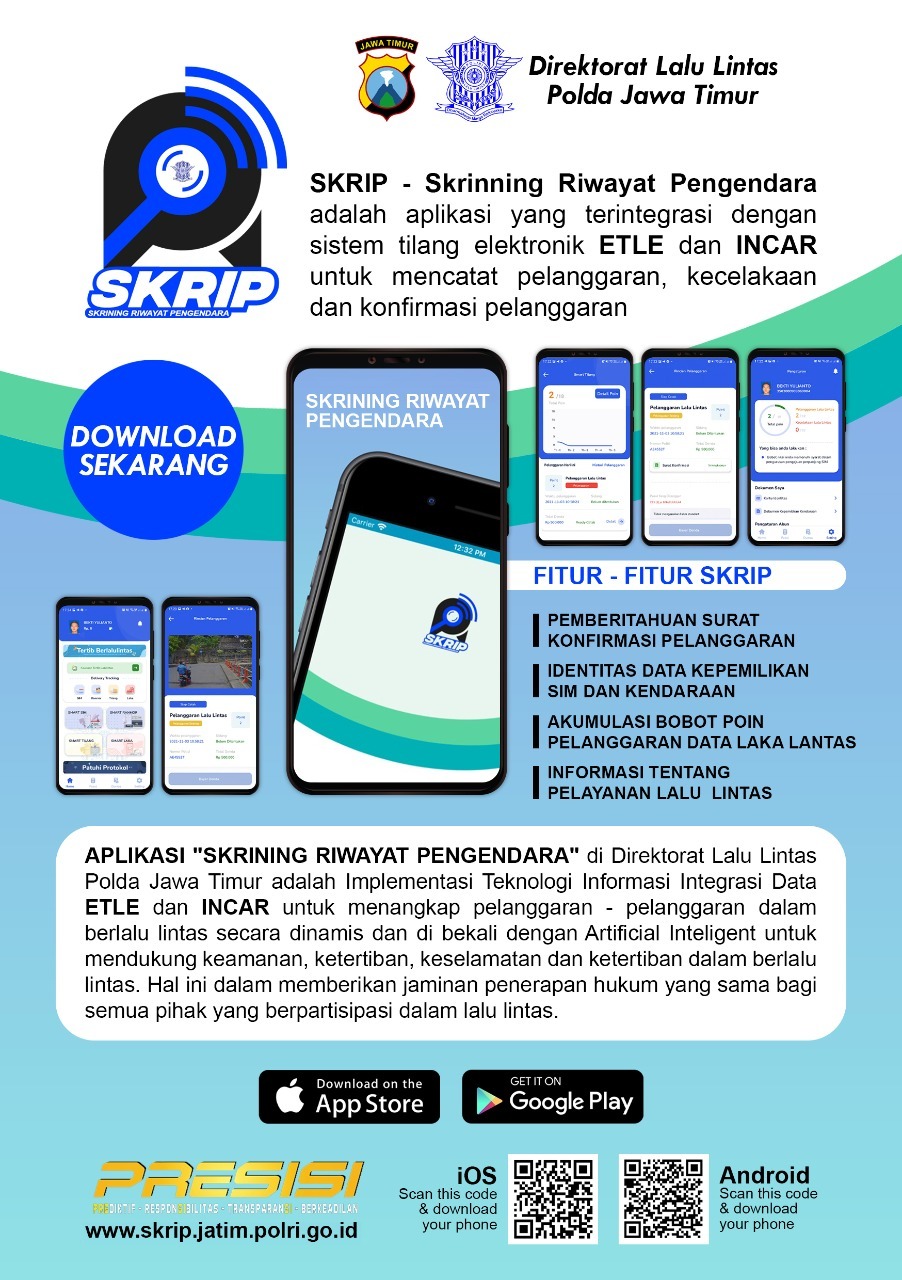 KLIKJATIM.Com | Bojonegoro--Ditlantas Polda Jawa Timur akan terapkan Skrining Riwayat Pengendara (SKRIP), Aplikasi ini berfungsi untuk mencatat pelanggaran, kecelakaan dan konfirmasi pelanggaran bagi para pengemudi. Aplikasi ini untuk berinovasi dalam rangka menekan angka pelanggaran yang bisa menyebakan kecelakaan lalu lintas.