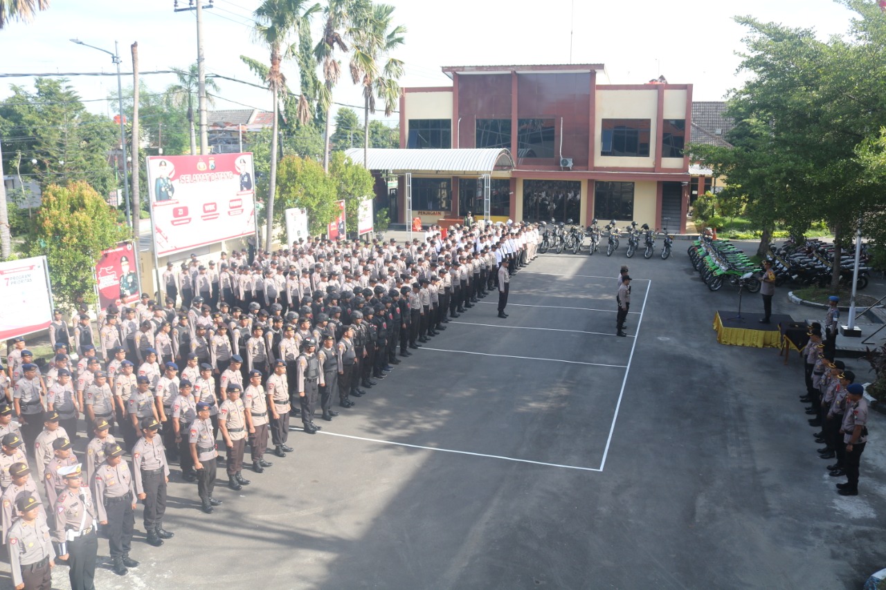 Senin (10/2/2020) ratusan personel disiagakan di halaman Mapolres Bojonegoro. Mereka akan disebar memastikan keamanan di 233 desa yang melaksanakan pilkades.