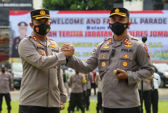 KLIKJATIM.Com | Jombang - Jabatan Kapolres Jombang diserahterimakan dari AKBP Agung Setyo Nugroho kepada pejabat baru AKBP Moh Nurhidayat. Serah terima jabatan dilakukan melalui prosesi pedang pora yang menerapkan protokol kesehatan secara ketat, Rabu (17/11/) pagi.