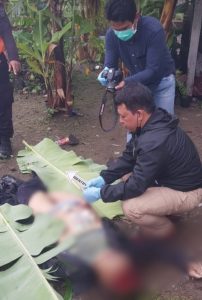 Jasad Joko terduga pembunuhan guru TK di Kecamatan Bambe, Gresik terduga pelaku pembunuhan Trianah (55) diperiksa petugas di TKP bunuh diri di Jombang, Rabu (24/11/2021).[/caption]