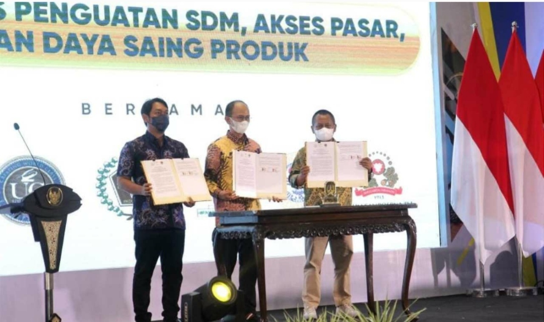 Penandatanganan kesepahaman dilakukan oleh Ketua PWI Jatim Lutfil Hakim bersama Ketua Umum Kadin Jatim Adik Dwi Putranto dan Ketua Umum HIPMI Jatim, Rois Sunandar Maming dan disaksikan oleh Gubernur Jatim Khofifah Indar Parawansa, Dirjen Pengembangan Ekspor Nasional Didi Sumedi, dan Ketua Umum Kadin Indonesia Arsjad Rasjid disela pembukaan pameran INAPRO Expo 2021, di Grand City Surabaya Kamis (25/11/2021).