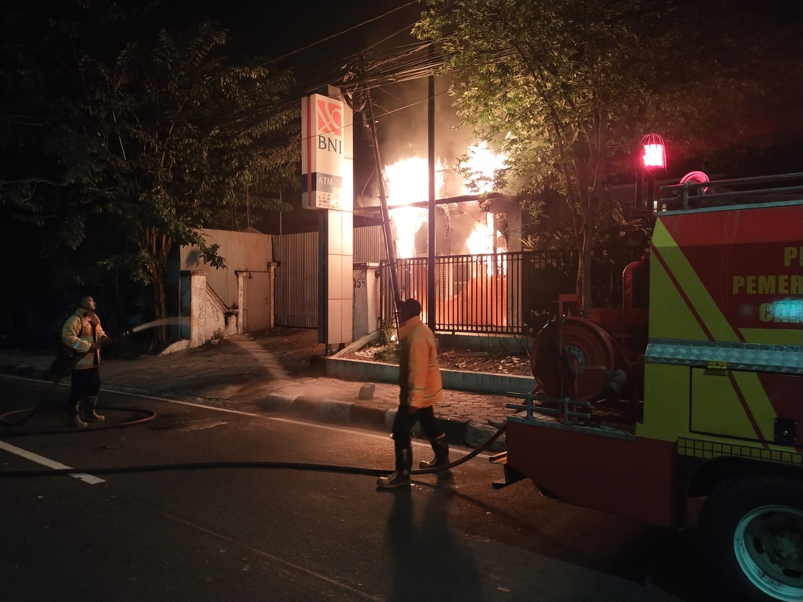 KLIKJATIM.Com | Gresik - Mesin Anjungan Tunai Mandiri (ATM) milik Bank BNI di Jalan Veteran Kecamatan Kebomas, Kota Gresik terbakar, Jumat (24/12/2021) dini hari. Kebakaran diduga hubungan arus pendek mesin ATM atau mesin pendingin (AC) yang di bilik ATM tersebut.