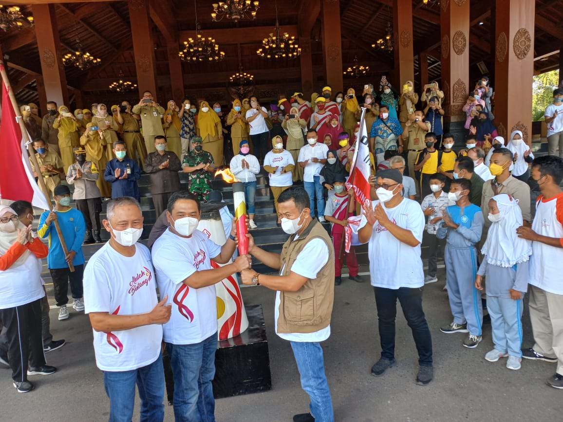 KLIKJATIM.Com | Ponorogo - Bupati Ponorogo, Sugiri Sancoko menerima obor Pekan Special Olympics Nasional (Pesonas) 2022 sesaampai di Bumi Reog, Selasa (28/12/2021).