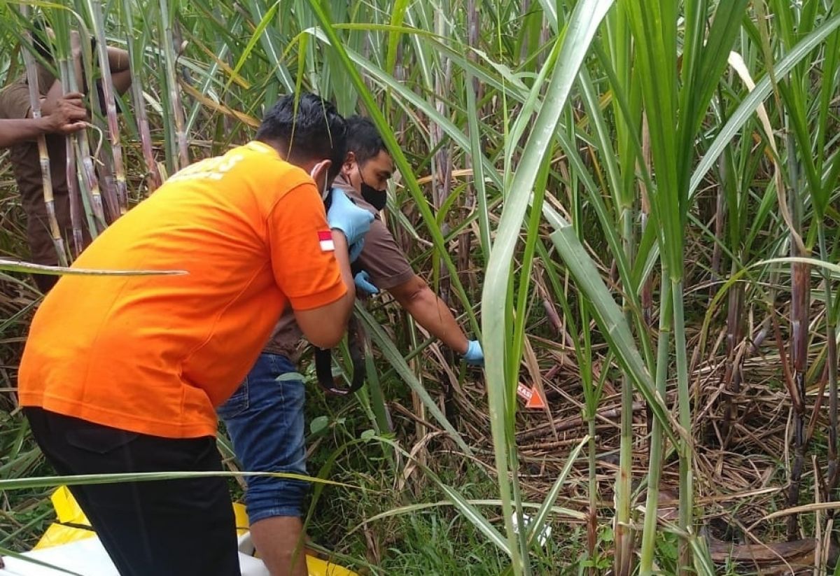 Penemuan mayat perempuan telanjang yang sudah membusuk di ladang tebu ini membuat gempar warga sekitar.