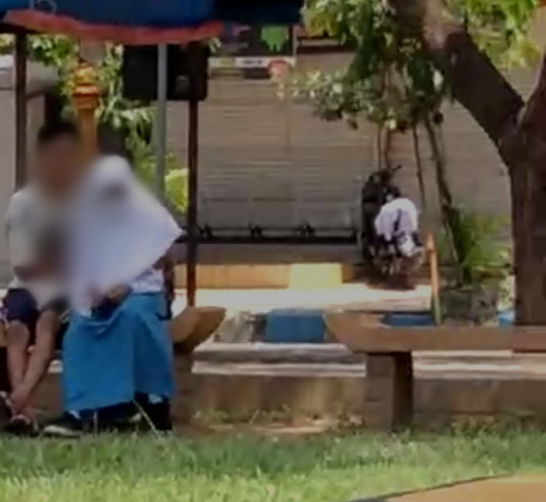 Keduanya terlihat mengawasi lokasi sekitar. Kemudian tangan remaja perempuan masuk ke dalam celana laki-laki di sebelah kanannya. Hal yang sama dilakukan oleh remaja laki-laki tersebut, dengan memasukkan tangan di balik jilbab gadis di sampingnya.