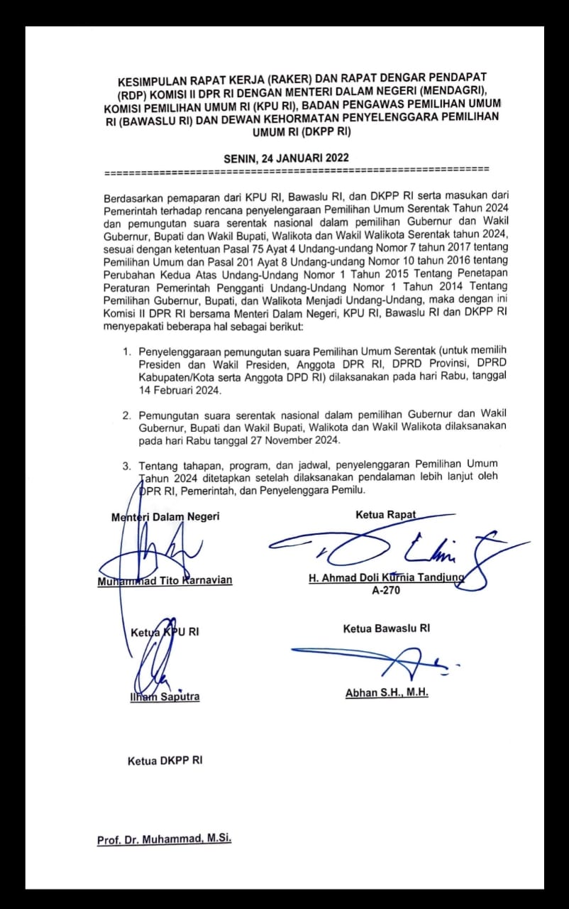 Untuk diketahui, salinan hasil kesepakatan tersebut ditandatangani oleh Mendagri Tito Karnavian, Ketua Rapat Ahmad Doli Kurnia Tandjung, Ketua KPU RI Ilham Saputra, dan Ketua Bawaslu RI Abhan.