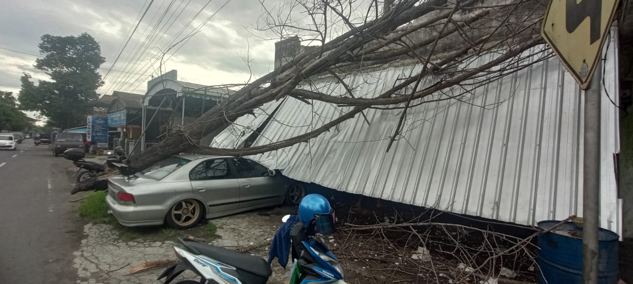 KLIKJATIM.Com | Tulungagung – Warga Desa Sumberdadi, Kecamatan Sumbergempol, Tulungagung, dikagetkan dengan tumbangnya pohon cemara di pinggir jalan raya desa setempat. Pasalnya, pohon yang disapu angin ini menimpa kanopi salah satu bengkel di lokasi hingga akhirnya ikut roboh dan mengenai mobil sedan yang parkir di bawahnya.