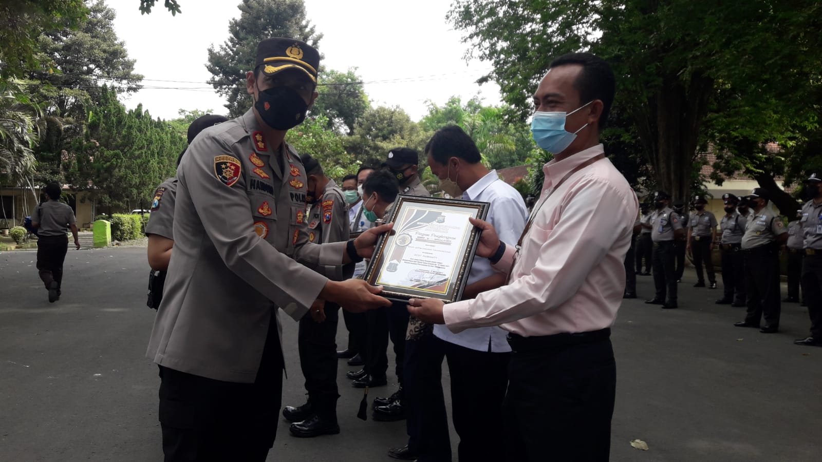 Kapolres Tulungagung, AKBP Handono Subiakto usai memimpin upacara HUT Satpam ke 41 pada Senin (31/01/2022) pagi tadi, secara simbolis menyerahkan reward kepada enam instansi di Tulungagung yang terpilih sebagai yang terbaik dalam Pekan Disiplin Satpam tahun ini.