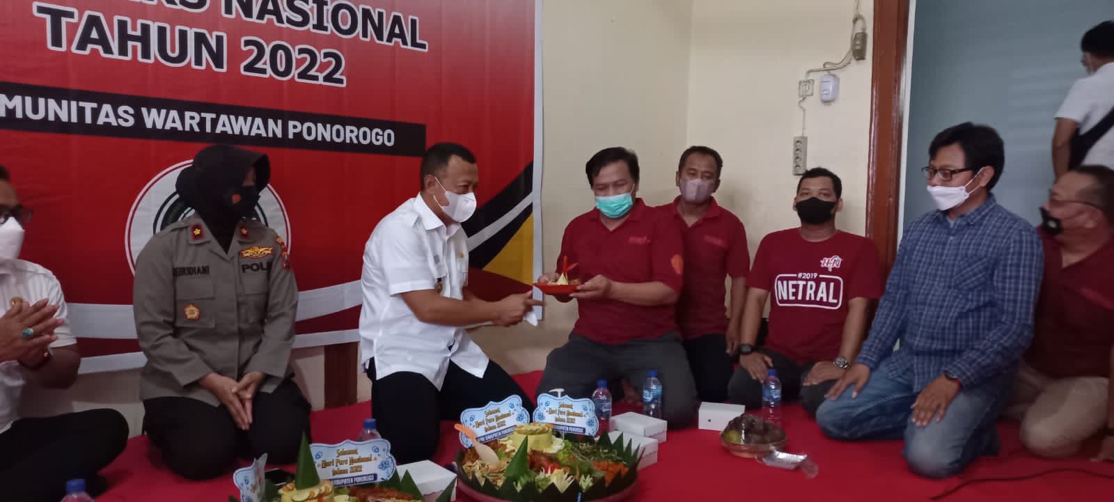 KLIKJATIM.Com | Ponorogo--Hari Pers Nasional (HPN) 2022, Bupati Sugiri Sancoko mendatangi balai wartawan di Jalan Raden Saleh. Sugiri potong tumpeng bersama sejumlah wartawan di Bumi Reog.