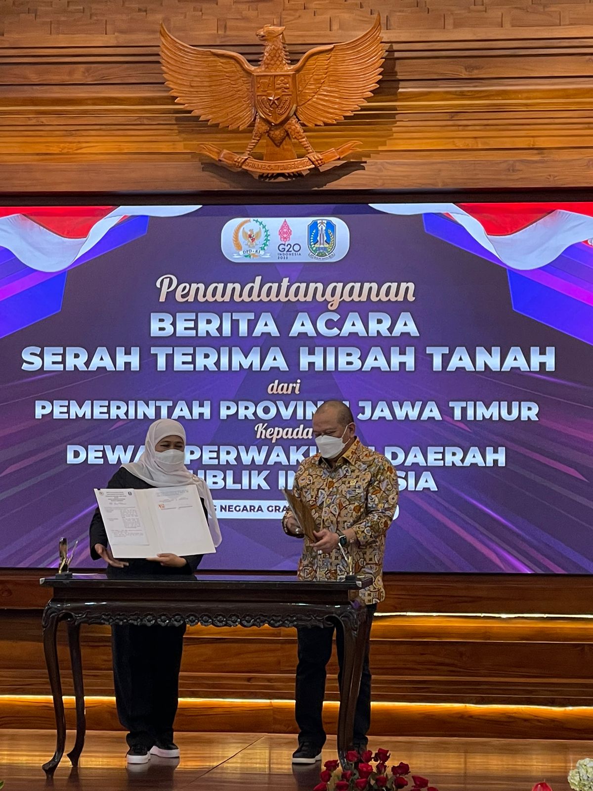 "Luar biasa cepat. 15 Bulan, artinya belum genap 1,5 tahun. Dan sudah ditandatangani antara Sekda Provinsi Jawa Timur dengan Sekjend DPD RI. Bahkan sudah selesai administrasinya. Sudah dalam bentuk Sertifikat Hak Pakai," imbuhnya.